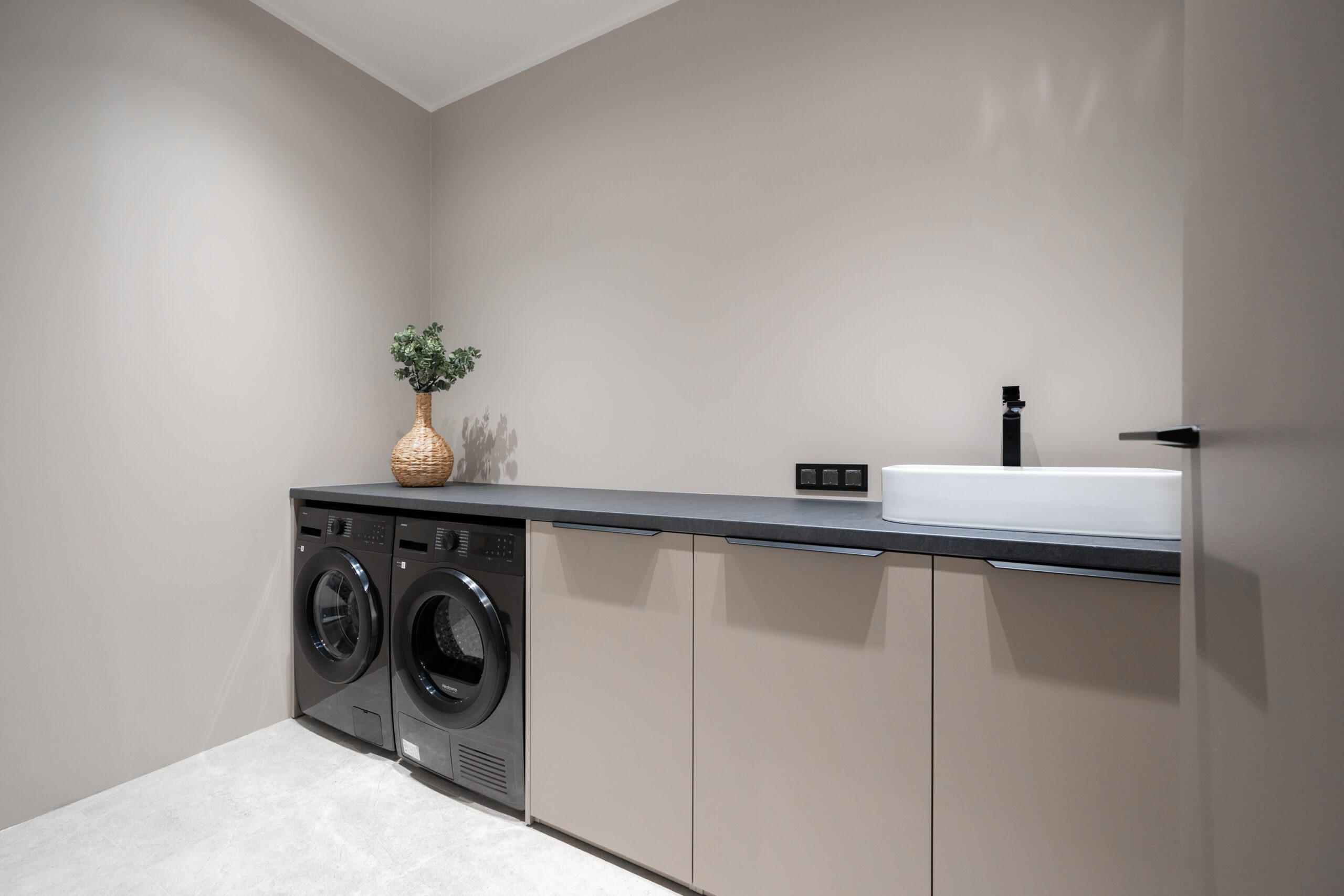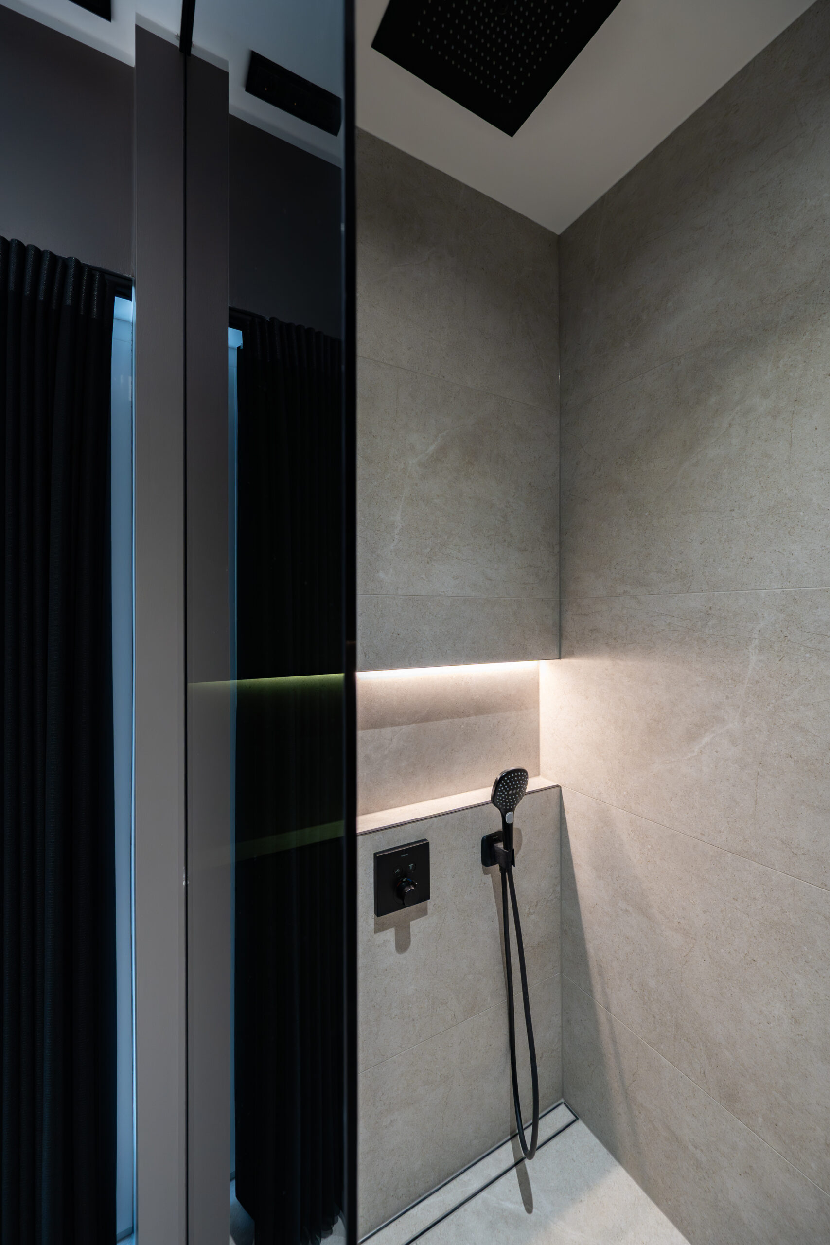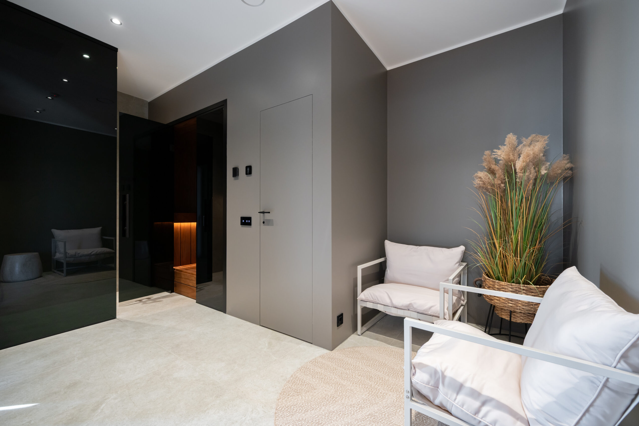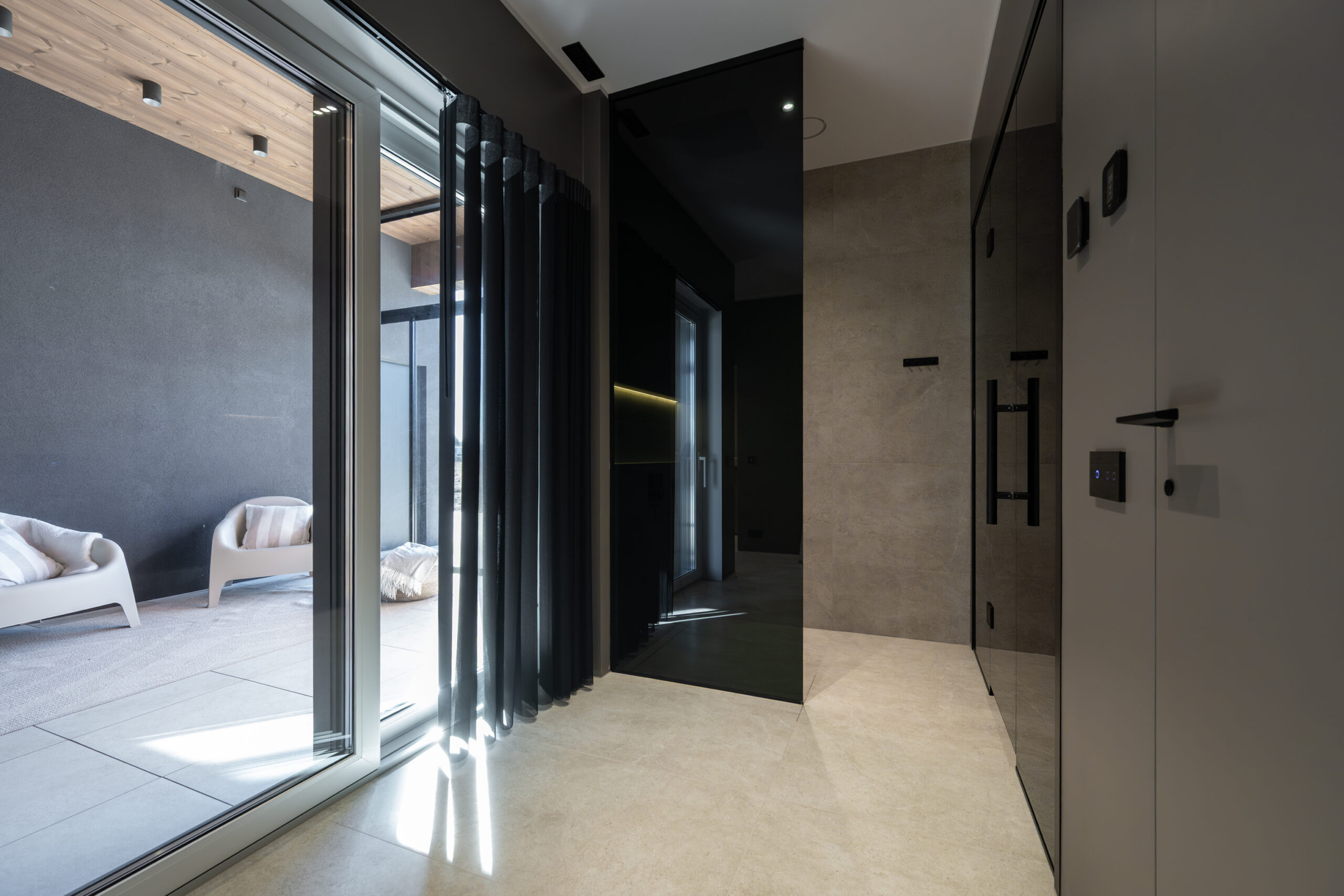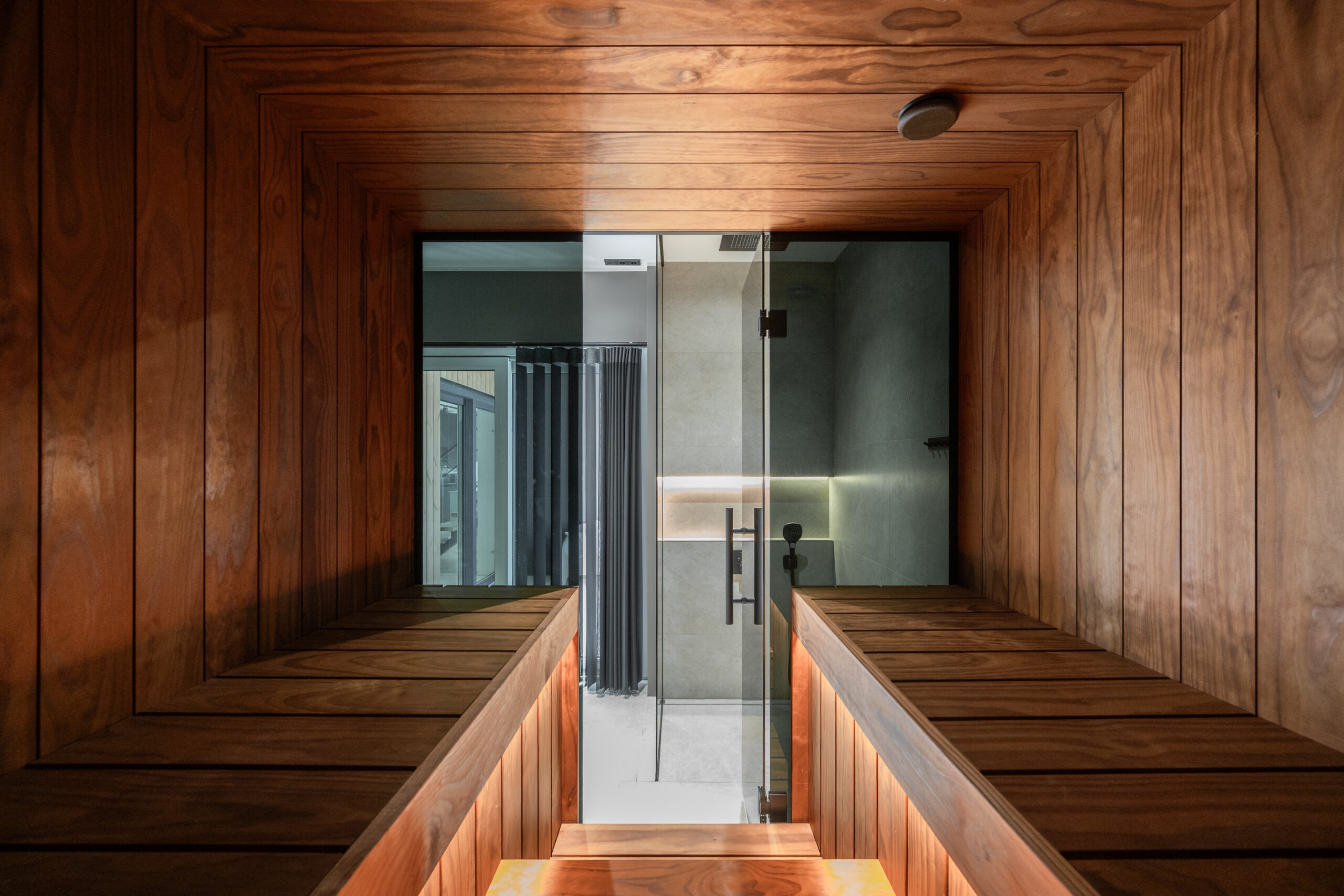 Saunaruumis asub innovaatilise õhusegamissüsteemi ning soolaioonide pihustusseadmega SAUNUM Spa keris (9 kw) koos AutoLeil targa leiliviskamise seadmega. Leiliruumi viimistluseks kasutatakse kvaliteetset ja elegantset termotöödeldud radiata voodri- ja lavalauda. Samuti on kodusesse spaasse paigutatud vihmadušš ning massaažifunktsiooniga käsidušš. Sanitaartehnikaks on kõikides pesuruumides puutetundlikud Hansgrohe segistid ning soojendusega Balteco peeglid.
