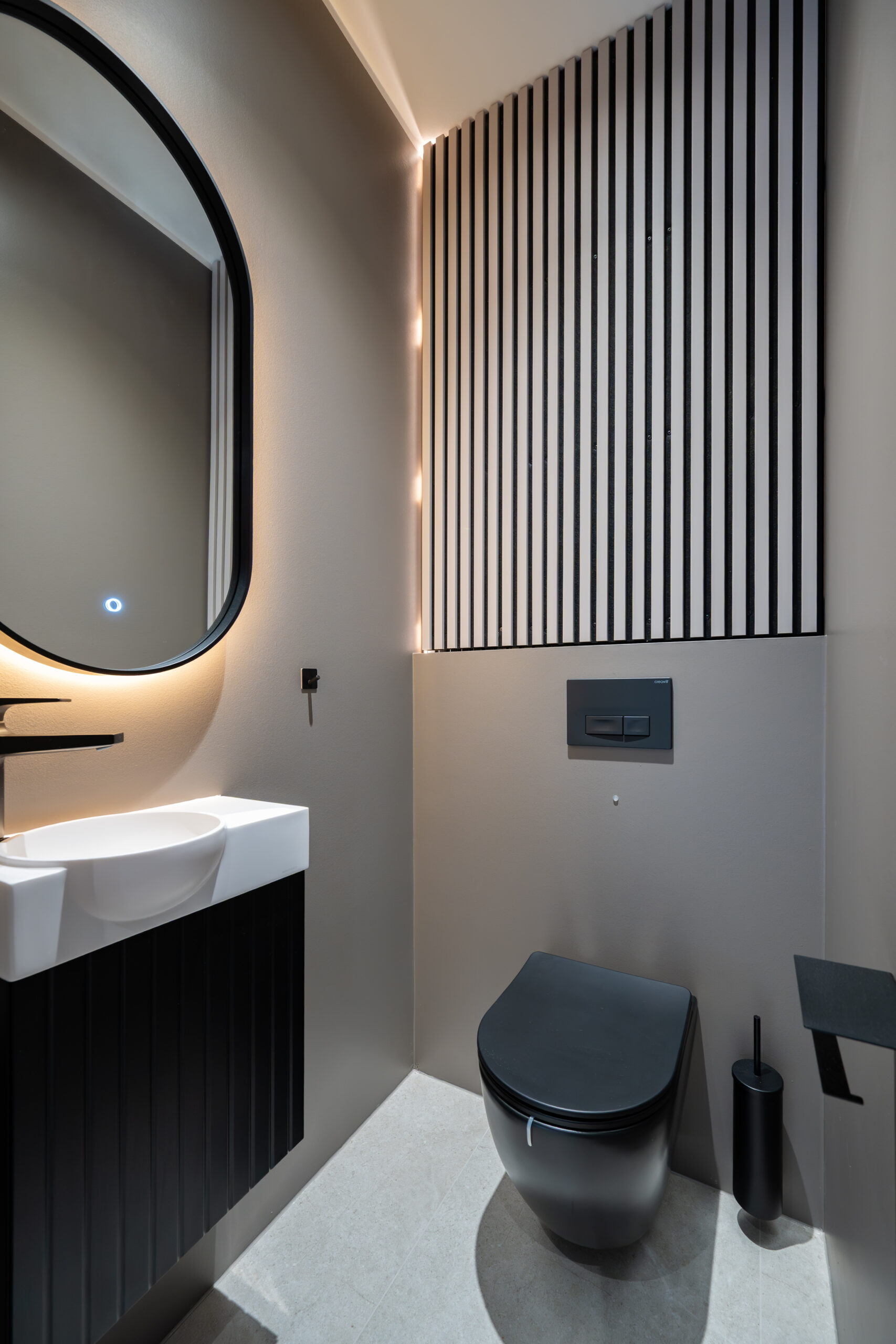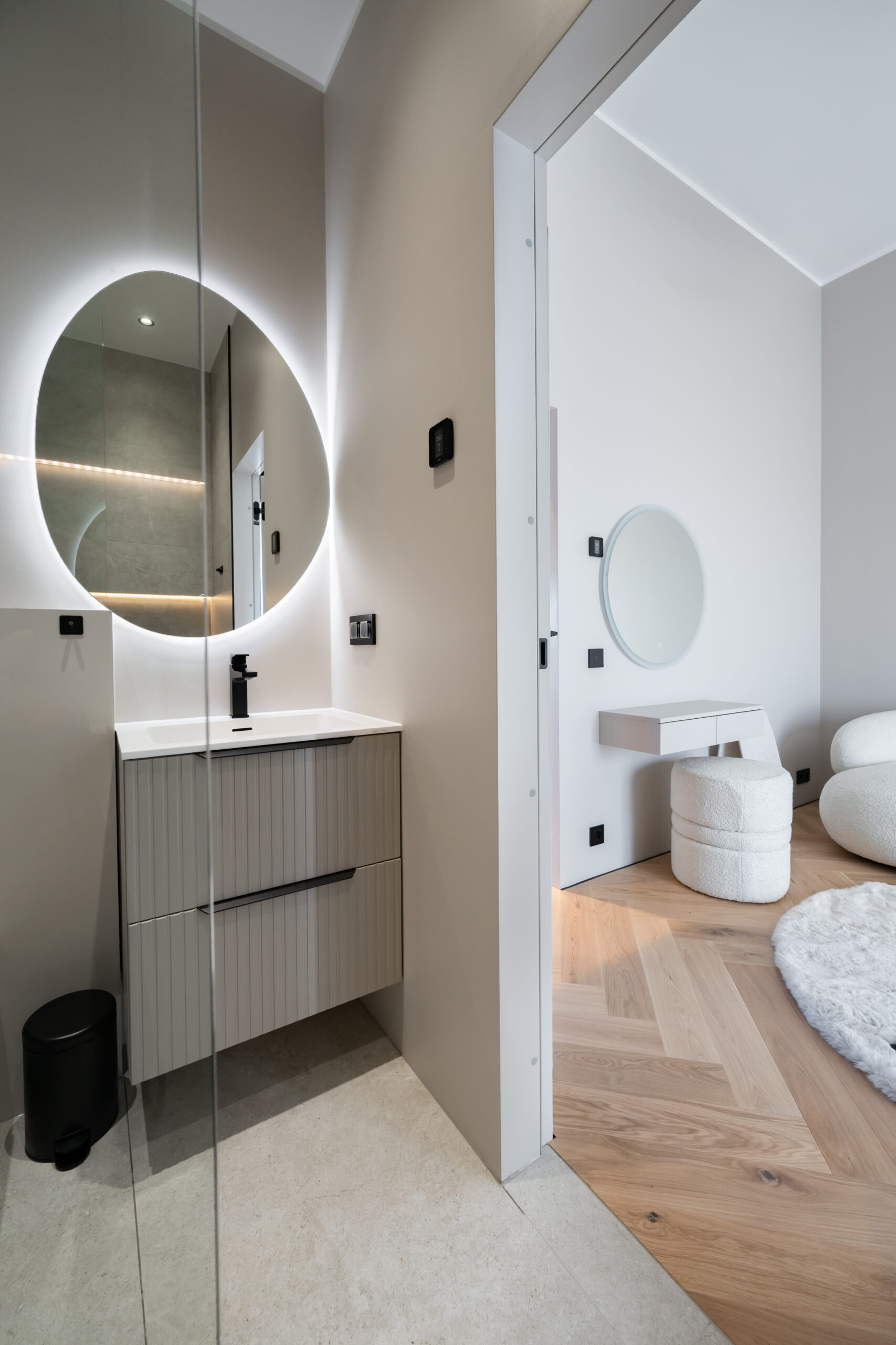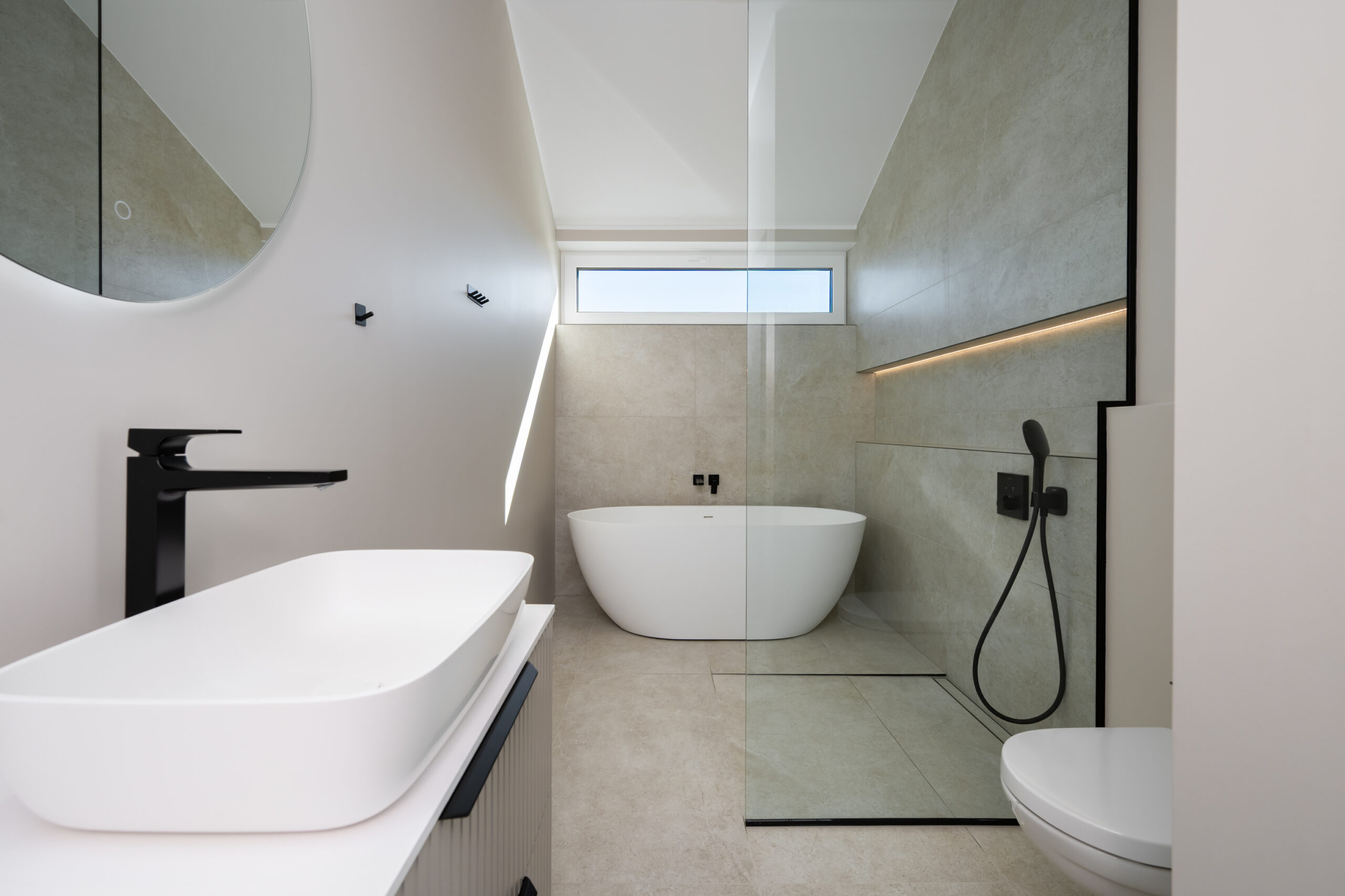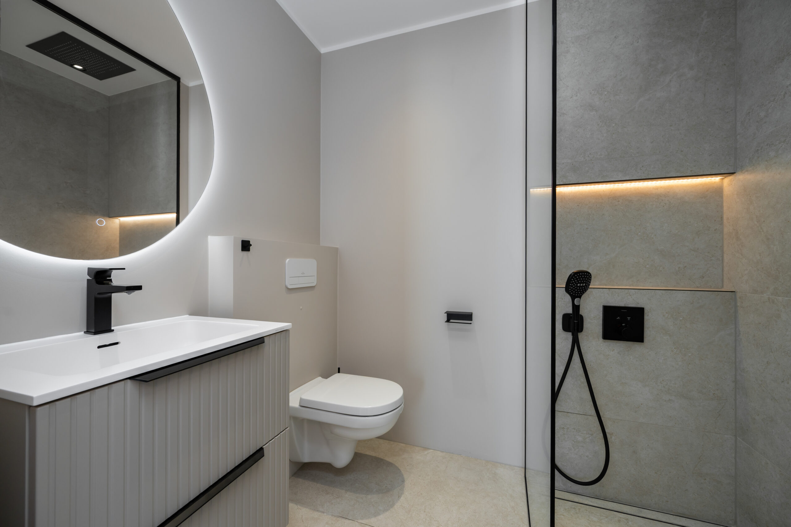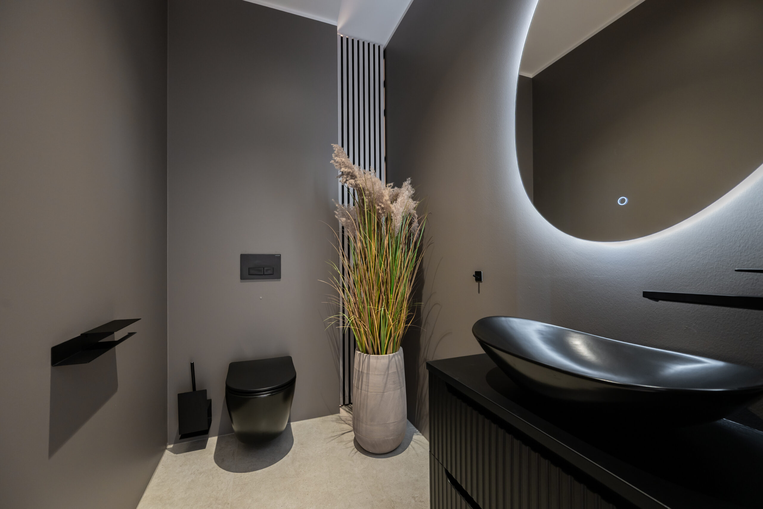 Saunaruumis asub innovaatilise õhusegamissüsteemi ning soolaioonide pihustusseadmega SAUNUM Spa keris (9 kw) koos AutoLeil targa leiliviskamise seadmega. Leiliruumi viimistluseks kasutatakse kvaliteetset ja elegantset termotöödeldud radiata voodri- ja lavalauda. Samuti on kodusesse spaasse paigutatud vihmadušš ning massaažifunktsiooniga käsidušš. Sanitaartehnikaks on kõikides pesuruumides puutetundlikud Hansgrohe segistid ning soojendusega Balteco peeglid.